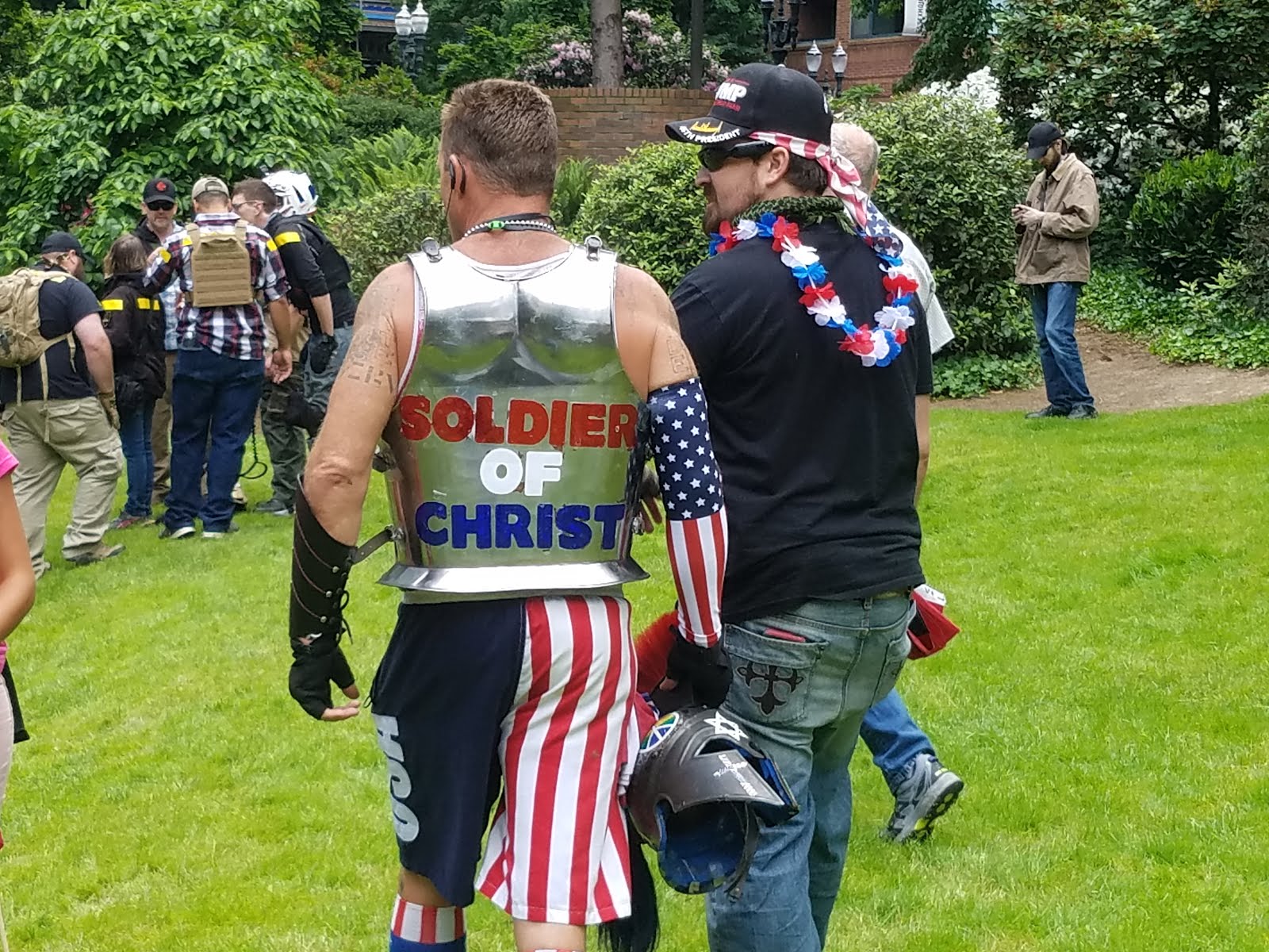 Many of the right-wingers came in provocative armor, inspired by Kyle Chapman, who spoke (the parts of speeches I heard were uninspiring and barely provocative, much less “hateful”). The atmosphere inside the rally was light. My impression was there was a good deal of LARPing going on, with a few serious characters. Oathkeepers worked the perimeter co-coordinating with police.