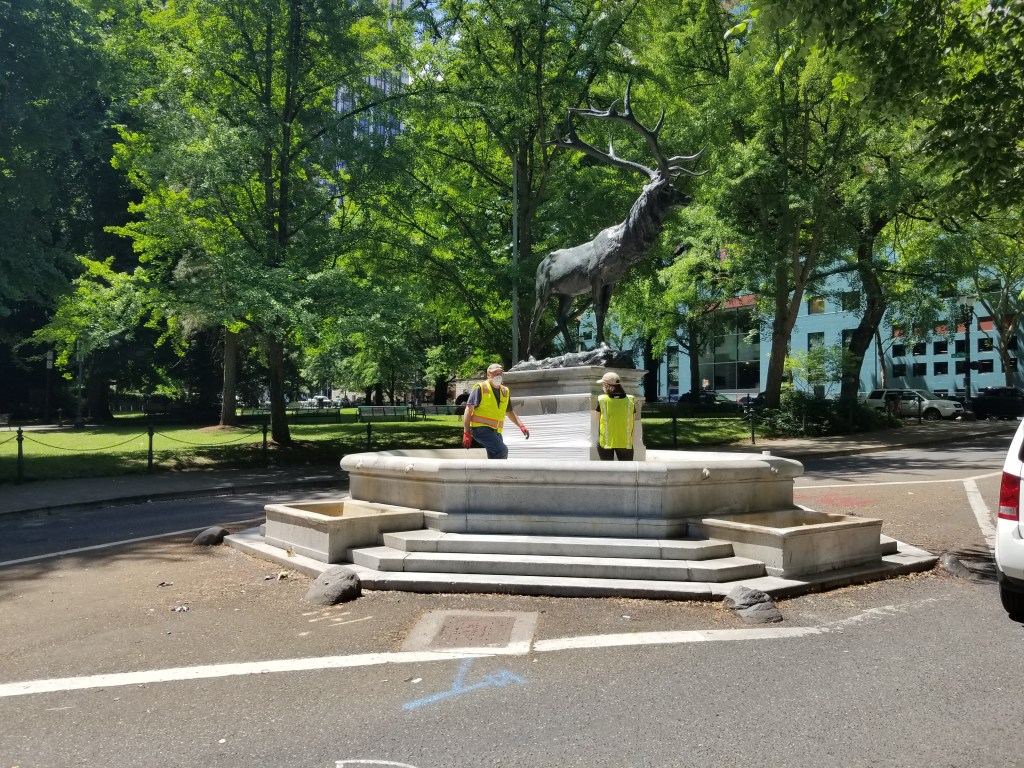 Public art need not celebrate white achievement to fall prey. The Elk Statue across from the city jail had to be rescued from rioters after its fountain became a nightly bonfire pit. Inspired perhaps by Native American wisdom, the rioters used every part of the monument they’d taken down, leaving none to waste, breaking it down with pick axes and using the rubble for projectiles. Overnight it became the equivalent of a Roman ruin; the city declared complete defeat and removed what was left.