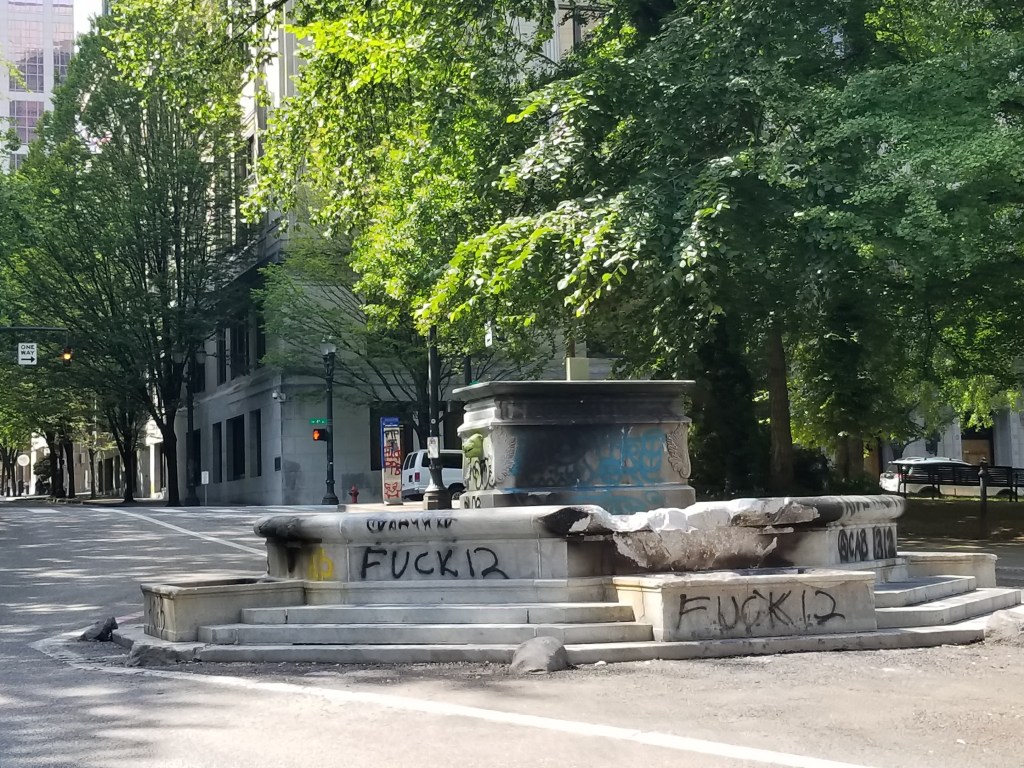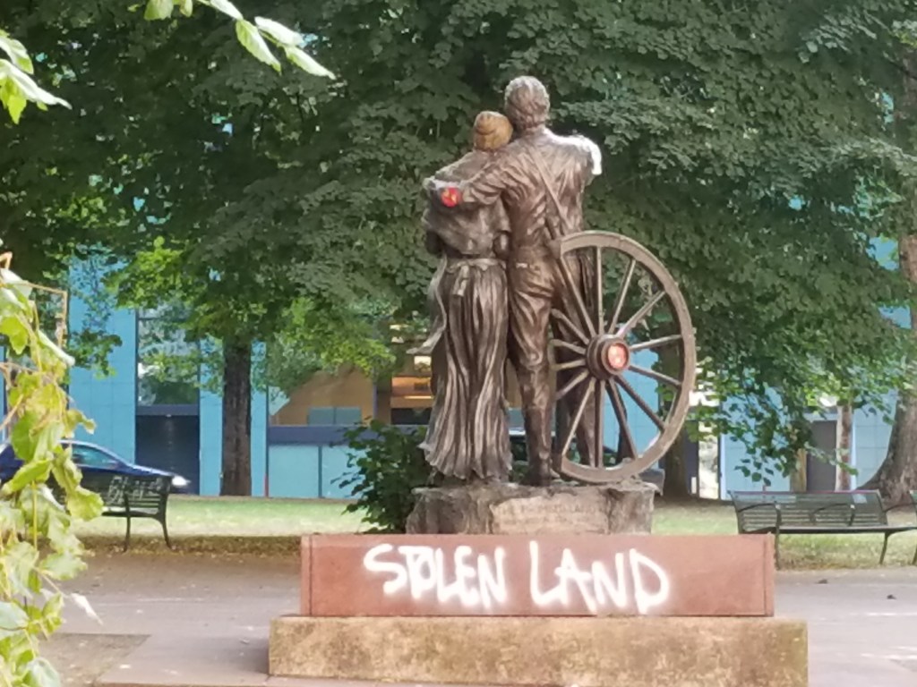 It was certain the Washington, Lincoln, Jefferson and Roosevelt statues were not going to be restored after antifa took it upon themselves to liberate the city of their oppressive presence, though no one’s been asking. Those and a statue of a settler family arriving in Oregon, The Promised Land, probably couldn’t be restored even if the will was there–antifa would simply keep coming back to deface or topple them–and according to new rules quietly instituted, in the future the city will remove them for antifa, if they deface a monument for a period of time with “social justice oriented” graffiti (see below).