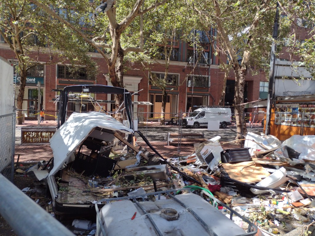 I don’t know explosions, but the damage seems too great to be from one of the propane tanks the food carts typically use for cooking. Seems remarkable no injuries have been reported; the “pod” of carts crowded together here on 5th Ave between Stark (renamed Harvey Milk) and Oak downtown seems to have at least one cart open 24 hours, catering to late night partiers.